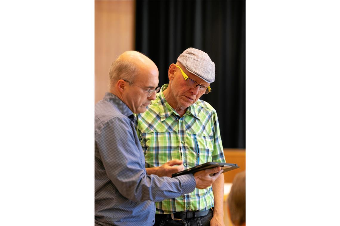 Reichen die Stimmen? Die Stadträte Armin Dobler (links) und Willy Härtner bei der Wahlanalyse im Bürgerhaus. Fotos: A. Becher