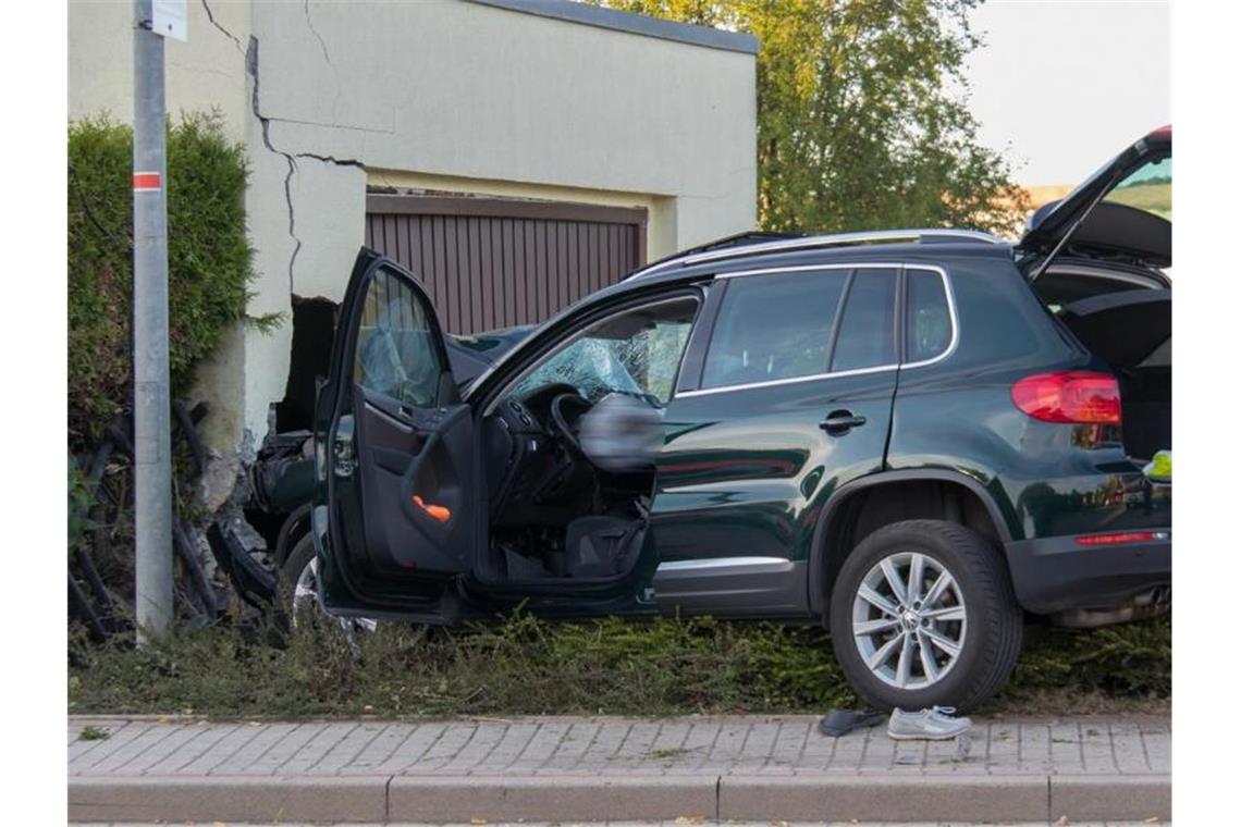 Ein beschädigter SUV steht nach einem Unfall vor einer Garage. Ein 79 Jahre alter Autofahrer hat eine Fußgängerin tödlich verletzt. Auch die 76-jährige Beifahrerin sei bei dem Unfall gestorben. Foto: Fabian Peikow/thueringen112.de