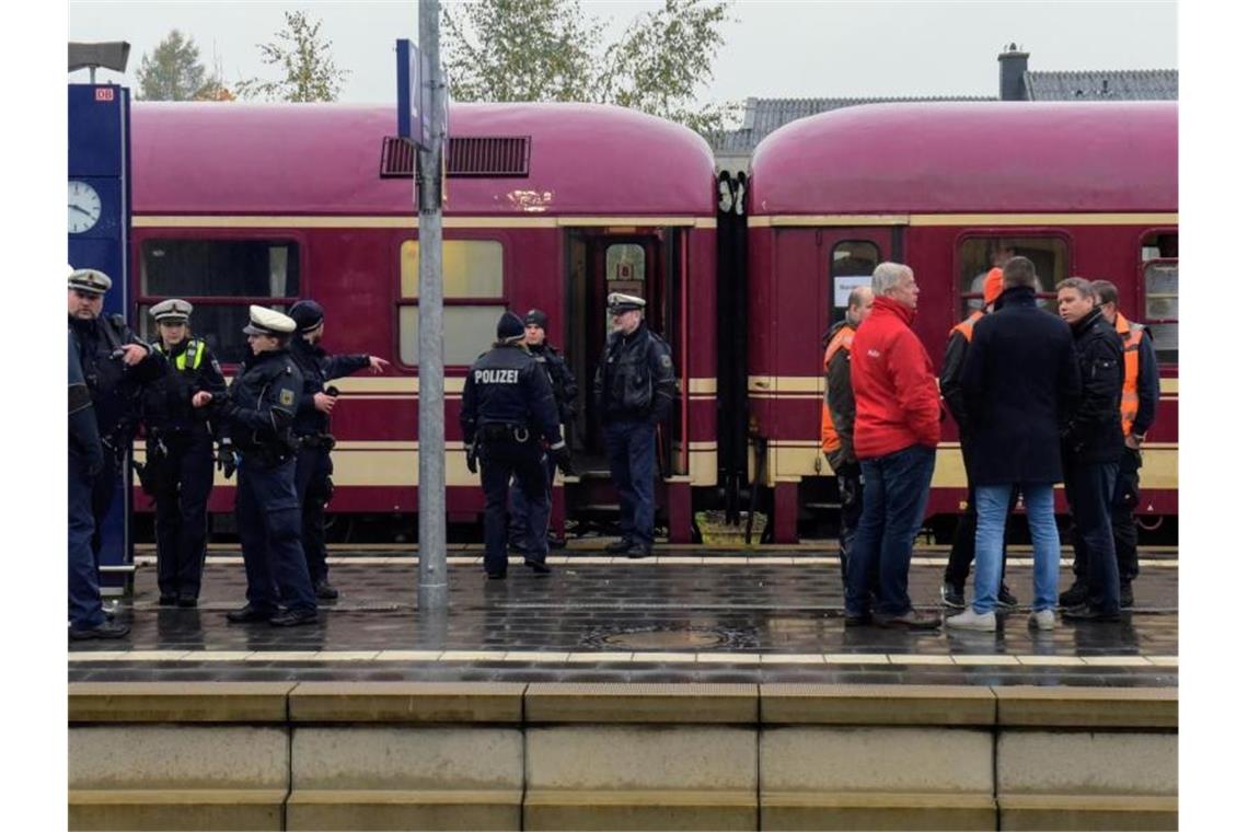 Die Polizei Dortmund führt gemeinsam mit der Bundespolizei Befragungen sowie eine Spurensuche im Partyzug durch und nimmt die Personalien der Fahrgäste auf. Foto: Günter Benning/dpa