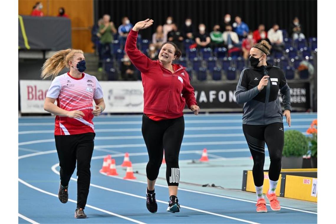 Christina Schwanitz (M) dreht in Leipzig eine Ehrenrunde. Foto: Martin Schutt/dpa-Zentralbild/dpa