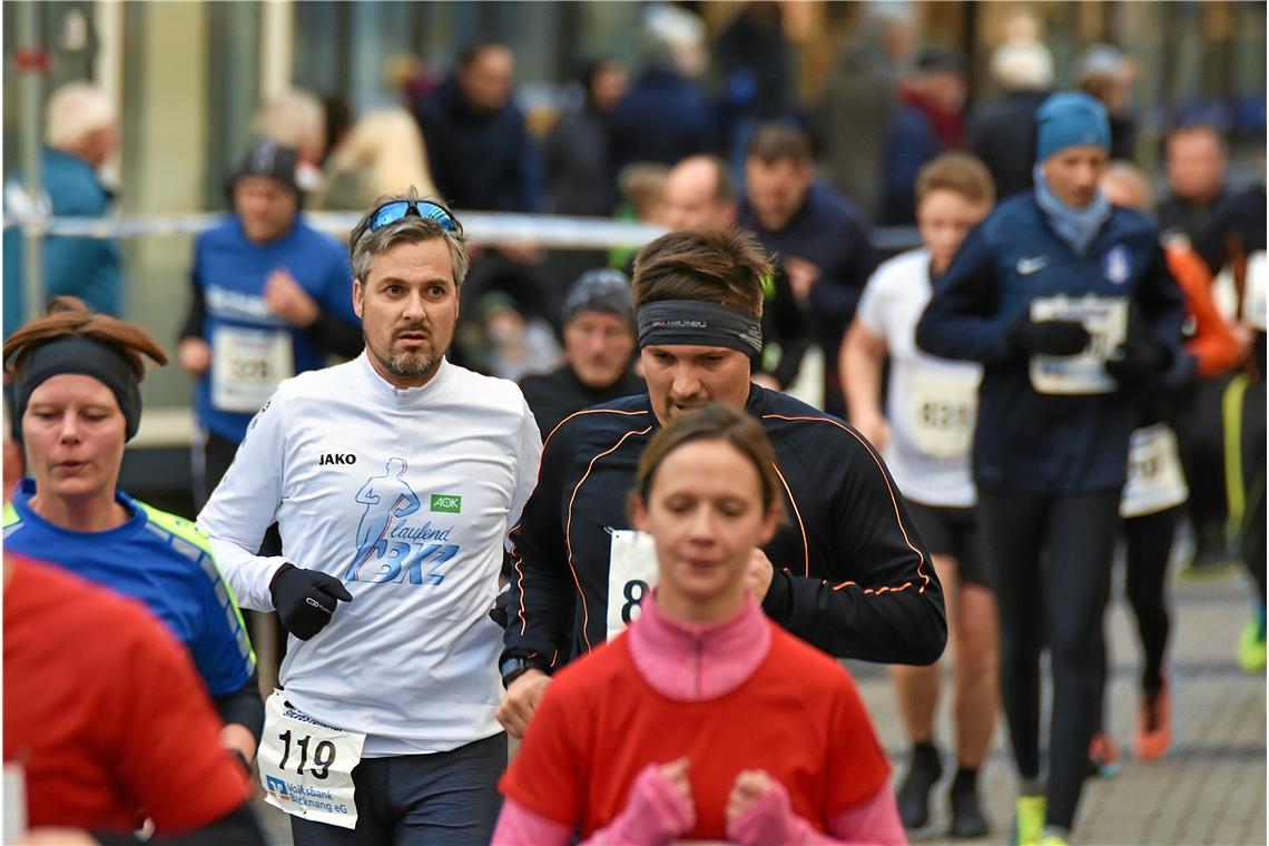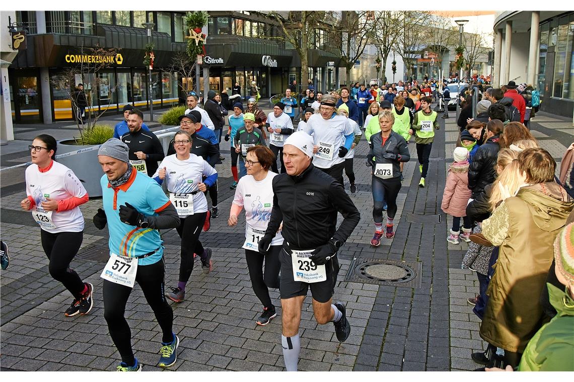 Die Bambinis machen um 14 Uhr den Anfang, der 10-Kilometer-Hauptlauf um 15 Uhr ist der abschließende Höhepunkt – daran hat sich in den vergangenen Jahren nie etwas geändert. Mit der Premiere des 5-Kilometer-Laufs im Jahr 2018 waren dazwischen aber sogar drei statt vorher nur zwei weitere Wettbewerbe unterzubringen. Binnen weniger Minuten wurden zunächst die Staffeln, dann die Kinder und Jugendlichen im Mini-Marathon und zuletzt die Teilnehmer an dem neuen Rennen auf die Reise geschickt. Optimal war der Ablauf nicht, daher probierten es die Macher dieses Mal ein wenig anders. Um 14.10 Uhr fiel der gemeinsame Startschuss für die Staffeln und die 5-Kilometer-Läufer, kurz darauf nahm der Nachwuchs seine 2,5 Kilometer in Angriff. Der Weisheit letzter Schluss war jedoch auch das nicht. „Die Felder und damit die verschiedenen Startnummern haben sich vermischt“, erklärt Rolf Hettich, „das hat es den Zuschauern erschwert, den Überblick zu wahren.“ Zudem hatten nicht alle 5-Kilometer-Läufer ihren Wettkampf beendet, als sich die Teilnehmer am 10-Kilometer-Rennen in Richtung Startlinie aufmachten. „Dann ist es schwierig, den Zielkanal bis zuletzt freizuhalten, aber eigentlich hätten es auch die langsameren Läufer verdient, ungehindert ins Ziel zu kommen“, schildert Hettich das Dilemma. Der einzige Ausweg ist, mit der Veranstaltung insgesamt etwas früher zu beginnen, „vielleicht um 13.45 Uhr oder 13.50 Uhr“, um den Zeitplan zwischen Bambini- und Hauptlauf zu entzerren. „Noch früher geht’s kaum, weil es an Silvester vorkommen kann, dass Wochenmarkt ist“, erklärt der erfahrene Organisator. „Und es ist sicher auch keine gute Idee, mit den Zeiten von Jahr zu Jahr zu wechseln.“ Eine gewisse Verlässlichkeit sollte gegeben sein.