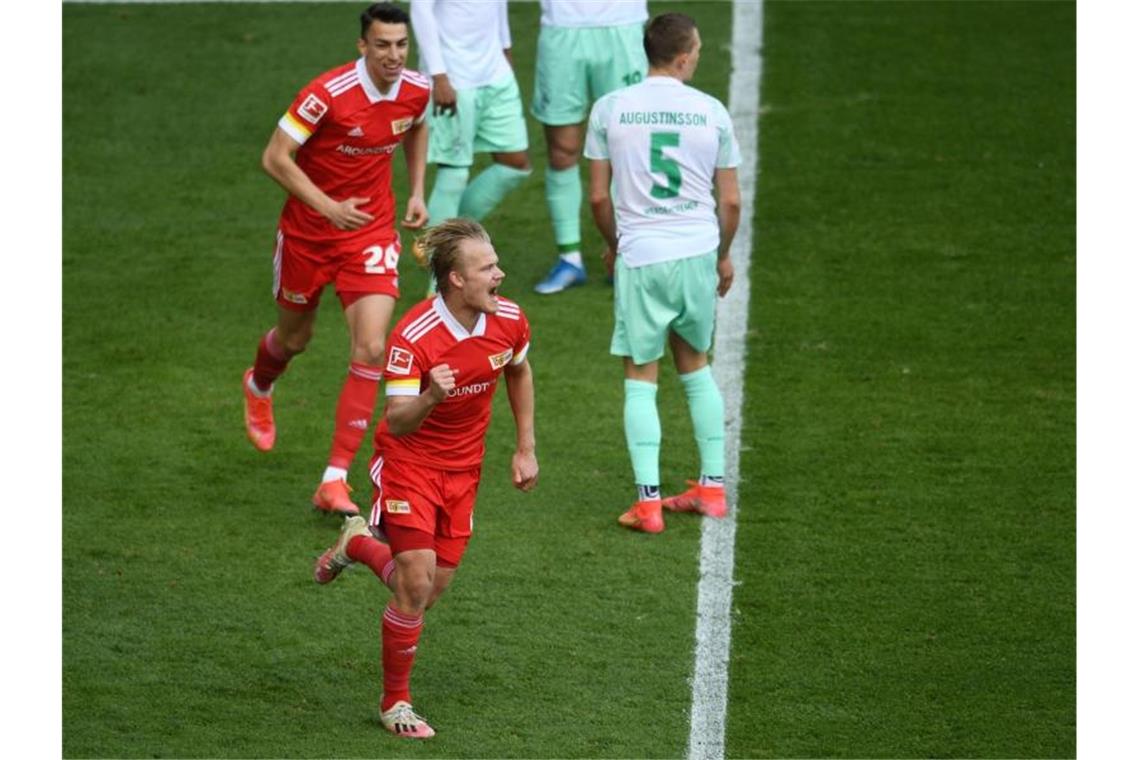 Joel Pohjanpalo war der umjubelte Mann beim Union-Sieg gegen Werder Bremen. Foto: Annegret Hilse/Reuters-Pool/dpa