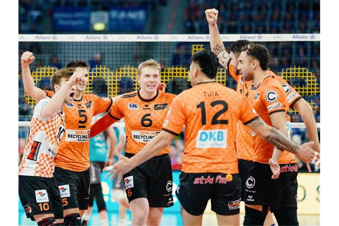 BR Volleys Jendryk (l-r), Reichert, Patch und Tuia jubeln nach Punktgewinn vor ihrem Trainer Cedric Enard. Foto: Andreas Gora/dpa