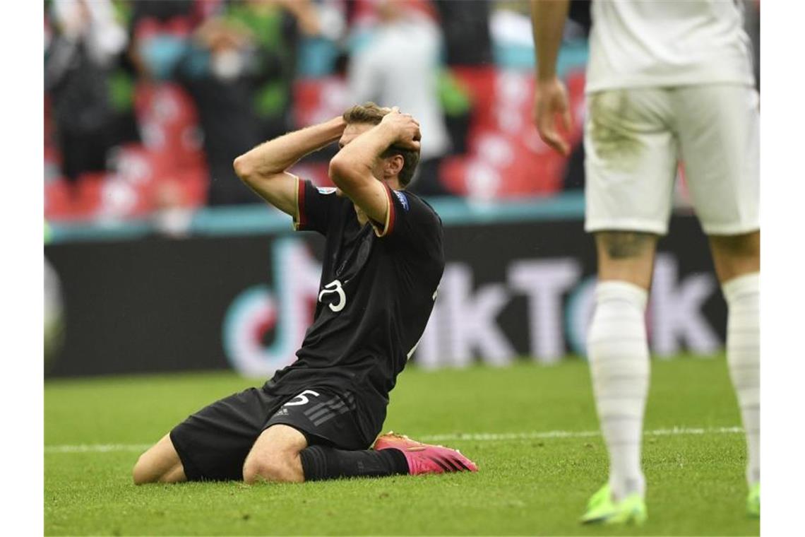 Aus 16 Metern schoss Müller knapp links vorbei. Den Ball traf er nicht optimal. Der Mann, der 39 oft wichtige Tore für Deutschland erzielte, sank auf die Knie, fasste sich entsetzt an den Kopf. Bei seiner Auswechslung wenig später schimpfte Müller ohne Ende - vor allem wohl über sich selbst. Er konnte den persönlichen EM-Fluch nicht abschütteln. 2012, 2016, 2021, drei EM-Turniere, null Tore. Bei drei Weltmeisterschaften müllerte es dagegen bei zehn Treffern.
