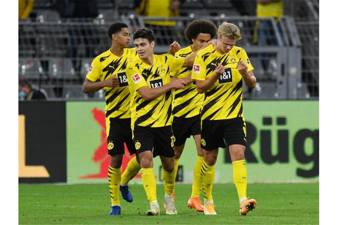Treffsichere BVB-Youngster: Erling Haaland (r) Giovanni Reyna (M) und Jude Bellingham. Foto: Bernd Thissen/dpa