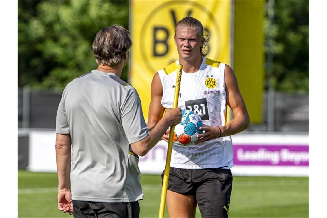Sportdirektor Michael Zorc (l) bezeichnet die Gerüchte um Erling Haaland als „heiße Luft“. Foto: David Inderlied/dpa