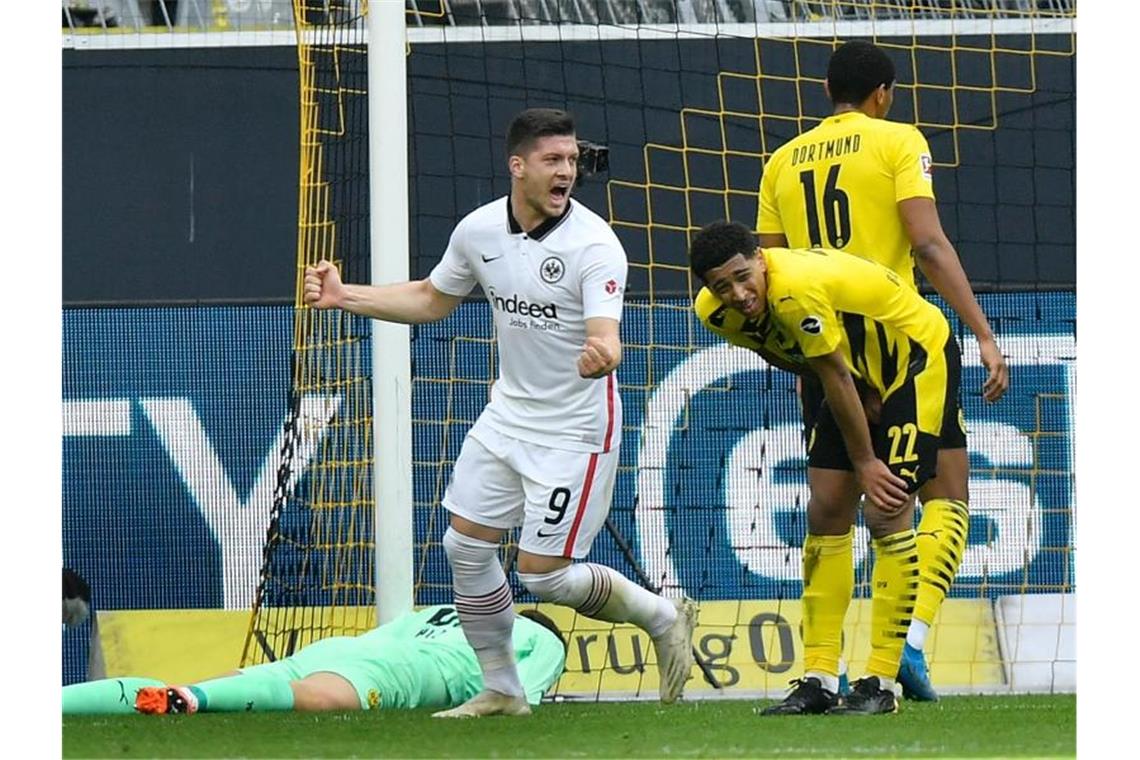 Frankfurts Stürmer Luka Jovic jubelt nach dem Tor zur 1:0-Führung - Dortmunds Mittelfeldspieler Jude Bellingham (r) steht geschlagen daneben. Foto: Martin Meissner/Pool AP/dpa