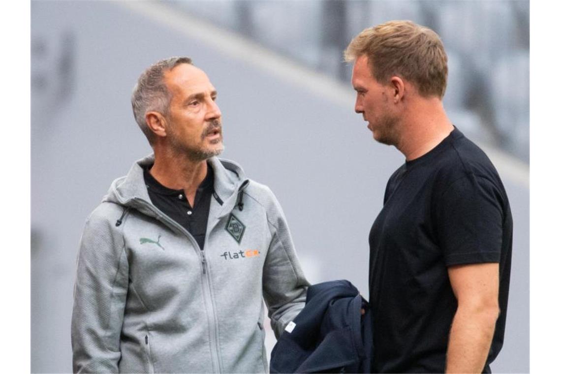 Die Bayern um Trainer Julian Nagelsmann (r) treffen zum Saisonauftakt auf Mönchengladbach mit Coach Adi Hütter. Foto: Sven Hoppe/dpa