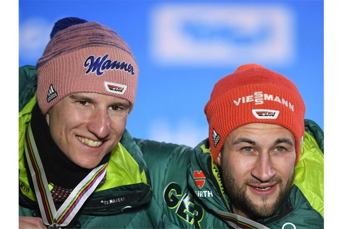 Der erste Weltcup der Skisprung-Saison findet im russischen Nischni Tagil statt. Mit dabei: Markus Eisenbichler (r) und Karl Geiger. Foto: Hendrik Schmidt/dpa/Archivbild