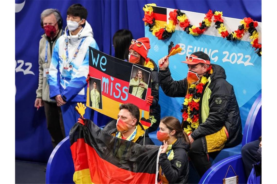 Das deutsche Eiskinstlauf-Team mit dem Plakat für Nolan Seegert und Minerva Hase. Foto: Sergei Bobylev/TASS/dpa