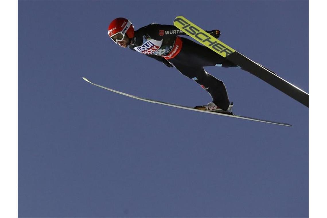 Die deutschen Skispringer um Markus Eisenbichler liegen im Teamwettbewerb nach dem ersten Durchgang vorn. Foto: Darko Bandic/AP/dpa