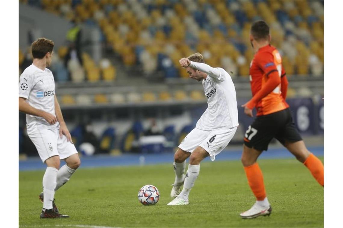 Gladbachs Christoph Kramer (M) bei einem Schuss auf das Donezker Tor. Foto: Efrem Lukatsky/AP/dpa