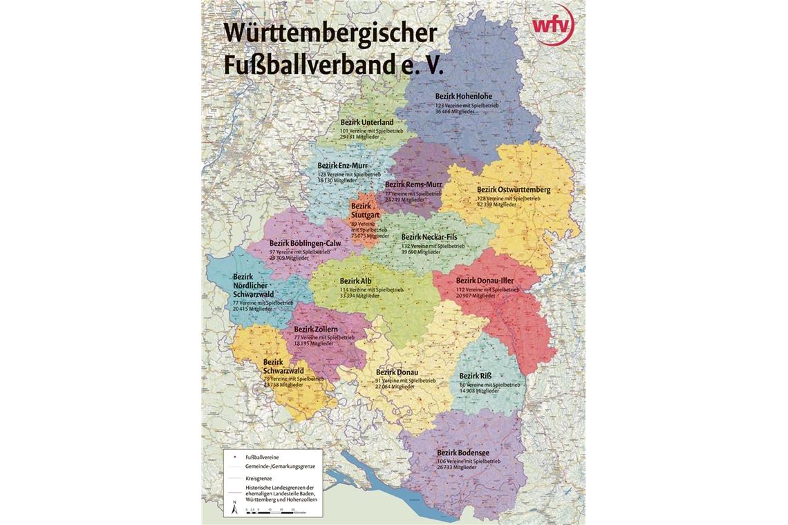 Rems-Murr steht mit Zollern und Nördlichem Schwarzwald auf dem vorletzten Platz. Mit nur 60 Vereinen ist Riß Schlusslicht. Der Bezirk Neckar-Fils führt mit 132 Klubs vor Ostwürttemberg und Enz-Murr (je 128).