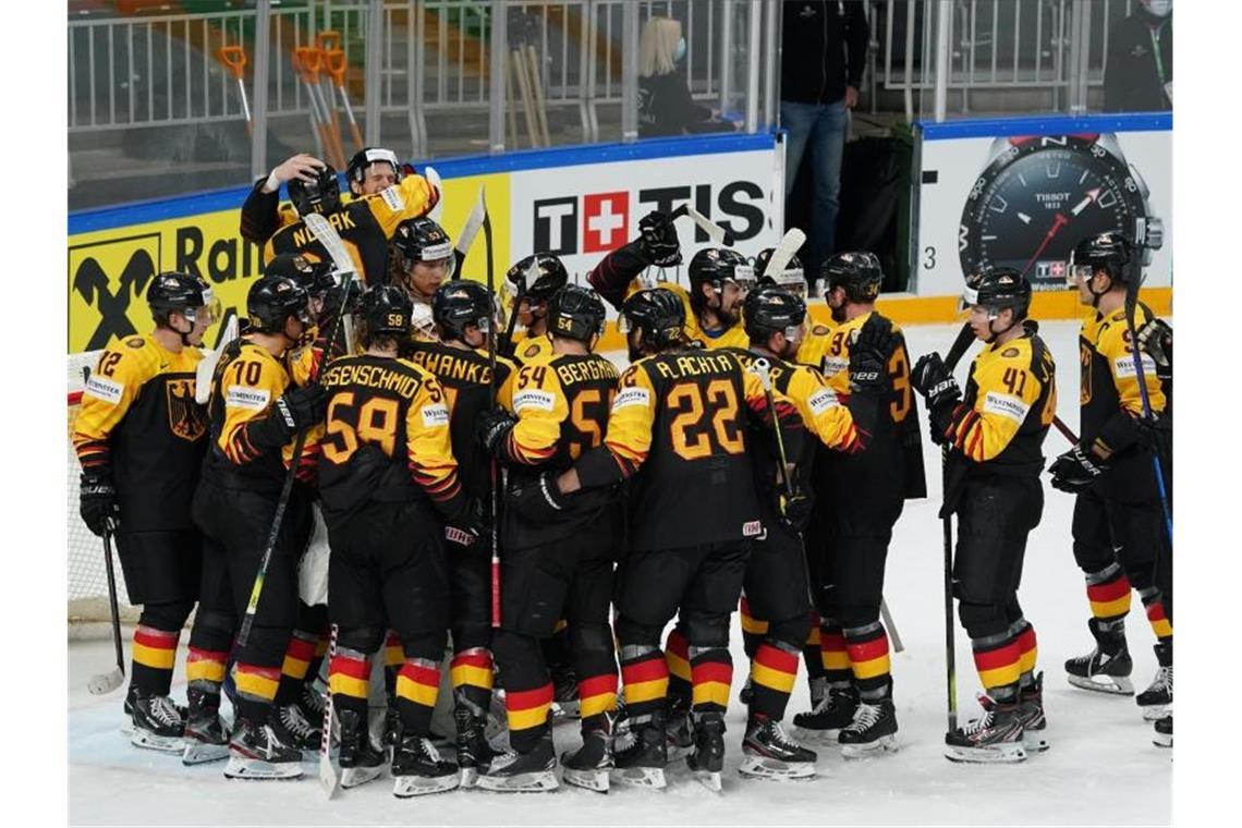 Das deutsche Nationalteam steht jubelnd nach dem Spiel auf dem Eis, nachdem es mit einem Sieg gegen Gastgeber Lettland das WM-Viertelfinale erreicht hat. Foto: Roman Koksarov/dpa
