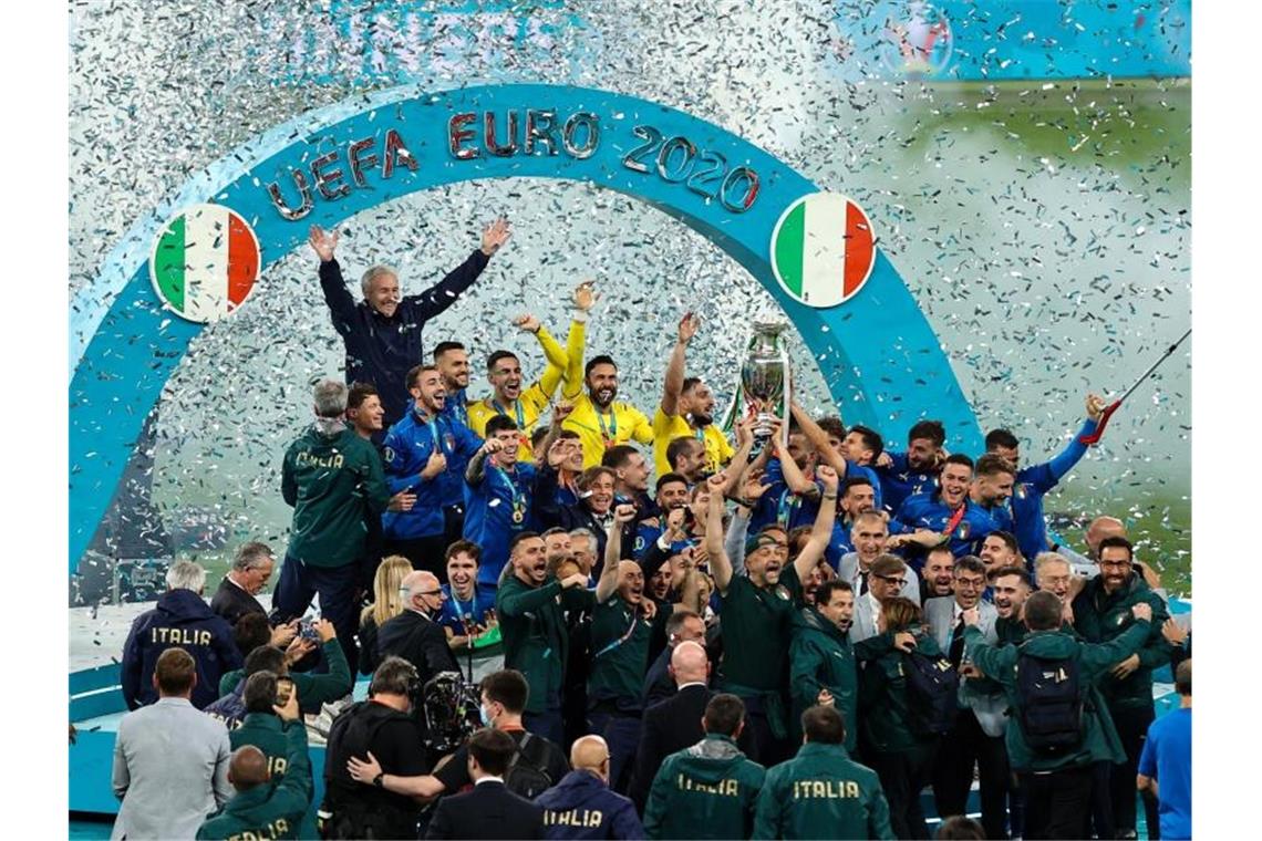 Italiens Spieler feiern nach dem Spiel mit dem Pokal die Europameisterschaft. Foto: Christian Charisius/dpa