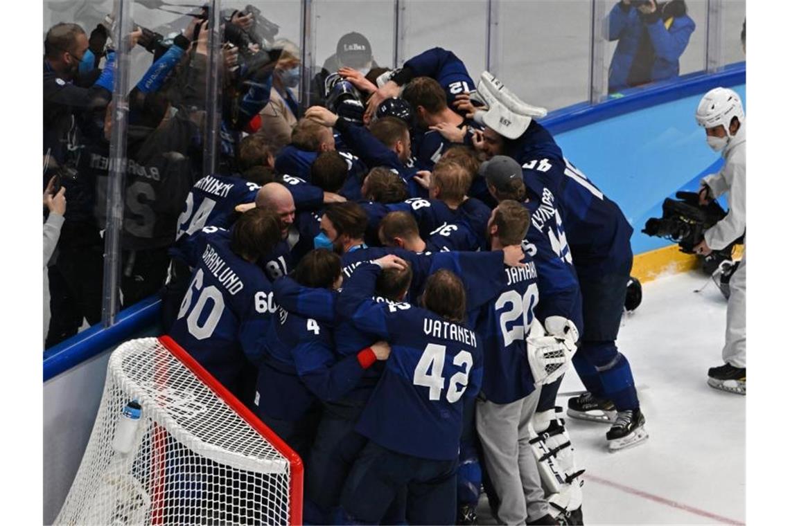 Die Finnen jubeln über Olympia-Gold. Foto: Peter Kneffel/dpa