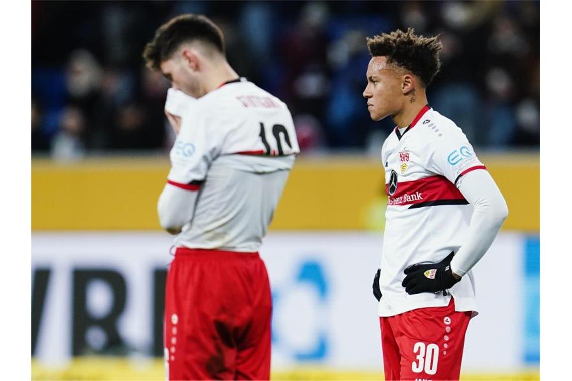 Stuttgarts Roberto Massimo (r) und Atakan Karazor zeigen sich nach der Niederlage in Sinsheim enttäuscht. Foto: Uwe Anspach/dpa