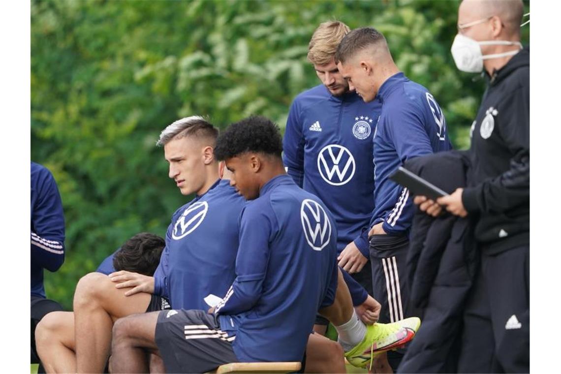 Auch die Youngster Nico Schlotterbeck (l), Karim Adeyemi (2.v.l) und Florian Wirtz (r) stehen im DFB-Aufgebot. Foto: Marcus Brandt/dpa