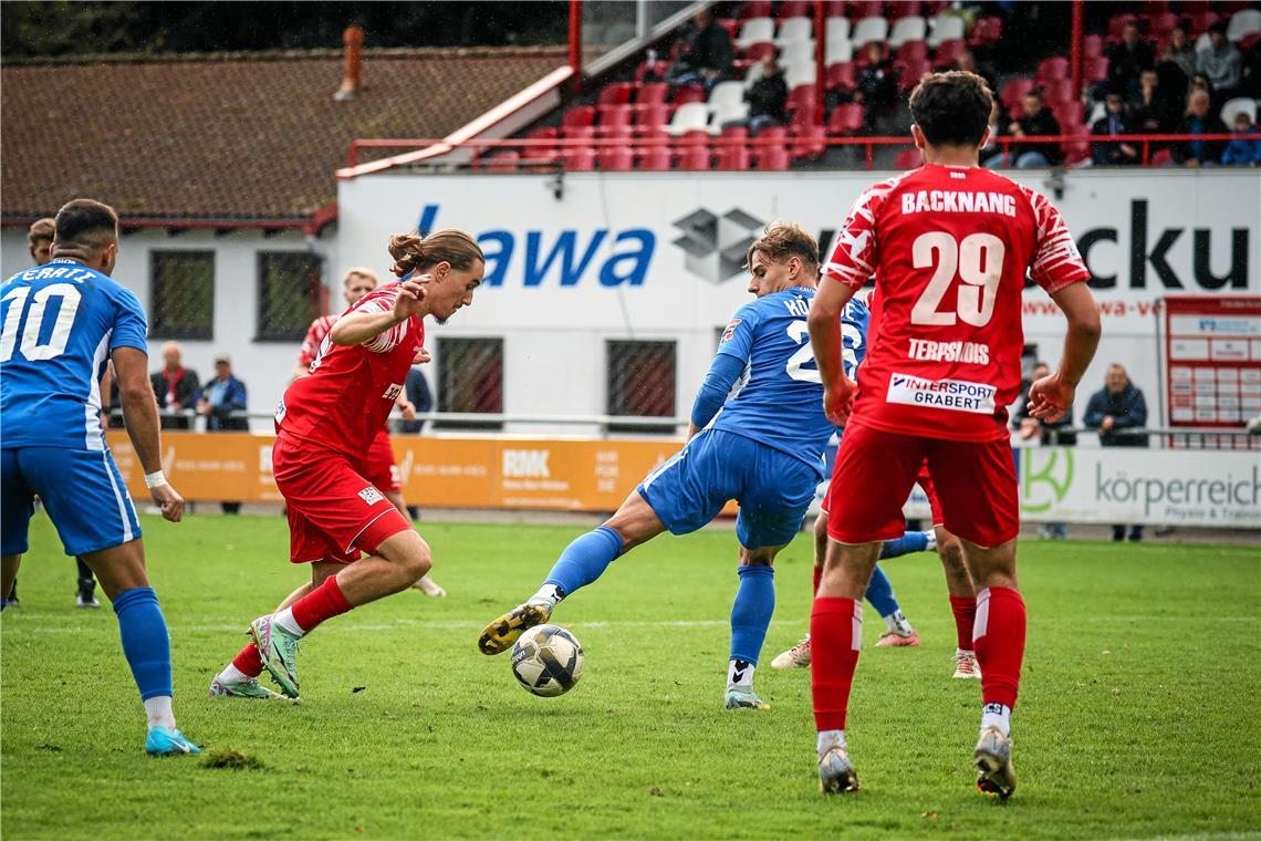 Joker Antonio Babic (links) hat in der fünften Minute der Nachspielzeit das Siegtor für die TSG Backnang erzielt. Foto: Alexander Becher