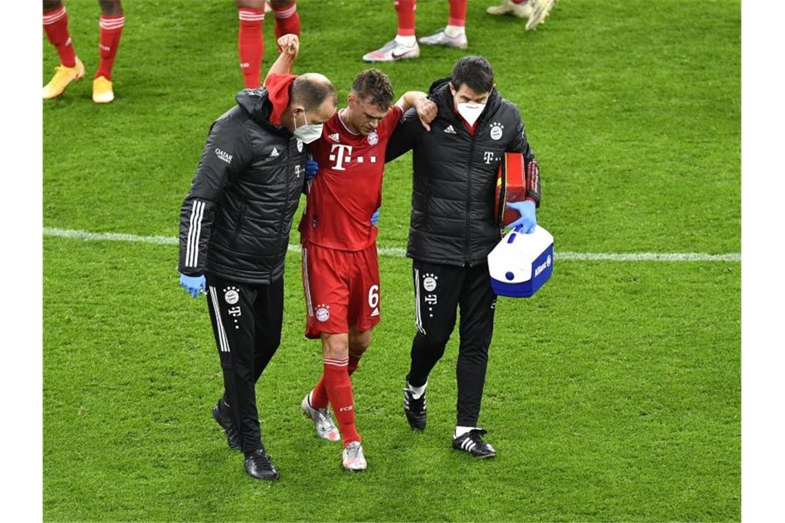 Beim Sieg der Bayern in Dortmund hat sich Joshua Kimmich verletzt und geht nach einer ersten Behandlung vom Spielfeld. Foto: Martin Meissner/Pool AP/dpa