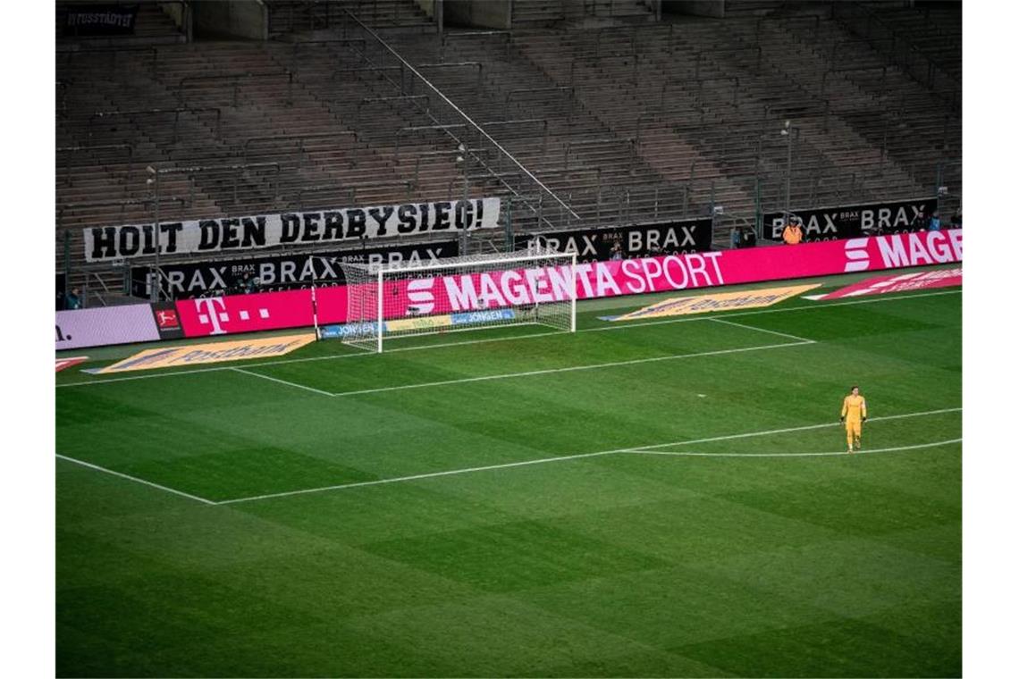 Einzig ein Plakat hinter dem dem Tor von Gladbach-Keeper Yann Sommer schafft ein wenig Derbyatmosphäre. Foto: Fabian Strauch/dpa