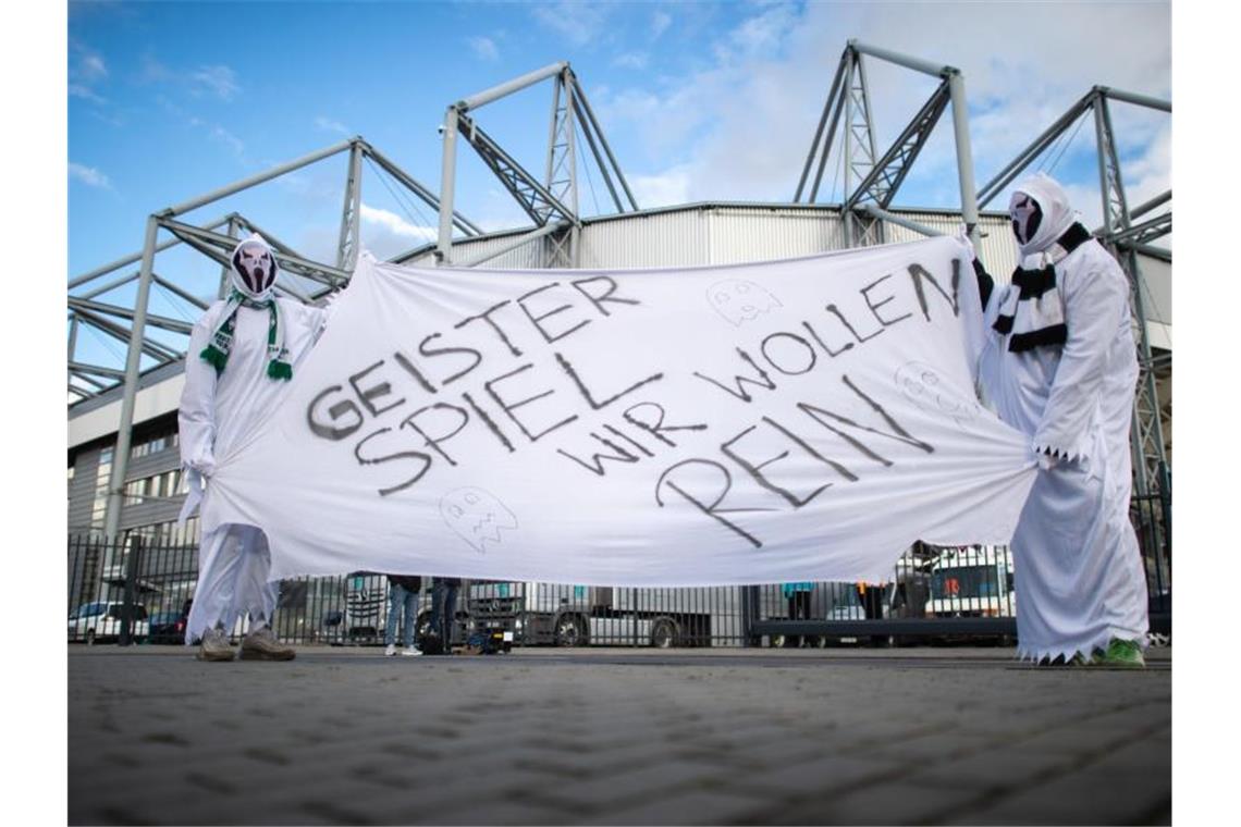 Vor verschlossenen Toren: Zwei als Geist verkleidete Gladbach-Fans vor dem Stadion. Foto: Jonas Güttler/dpa