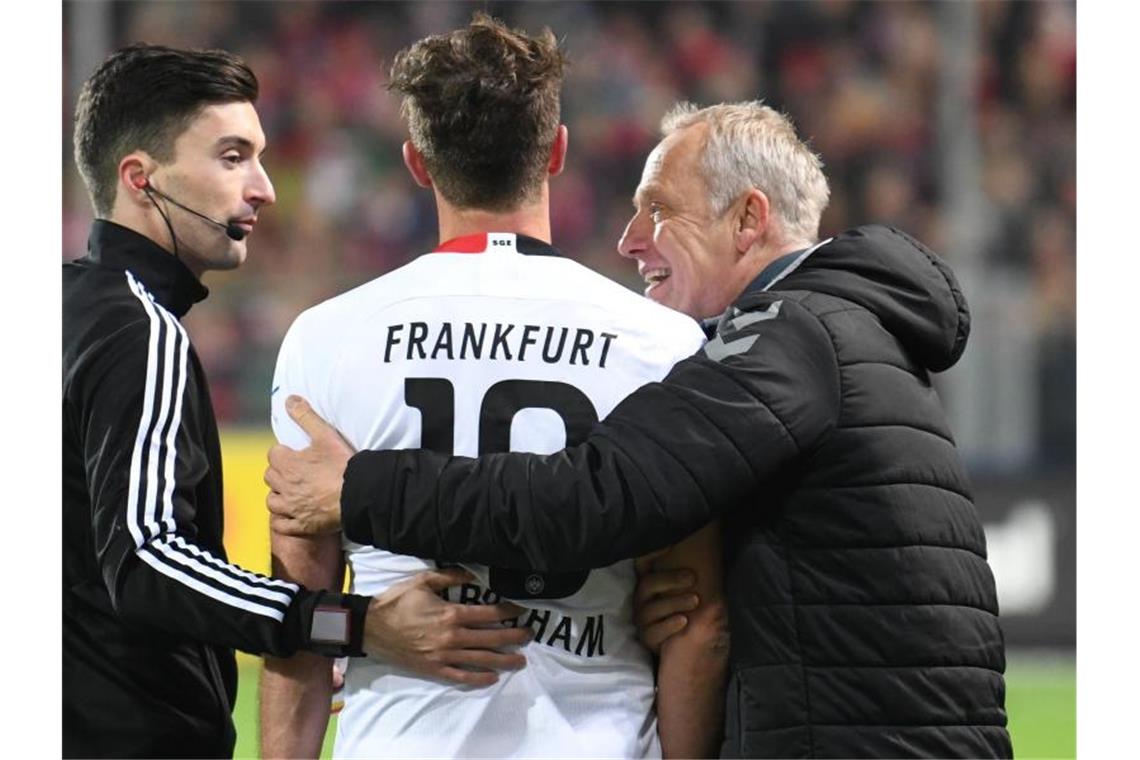David Abraham (M.) entschuldigte sich nach seinem Rempler bei Freiburg-Trainer Christian Streich. Foto: Patrick Seeger/dpa