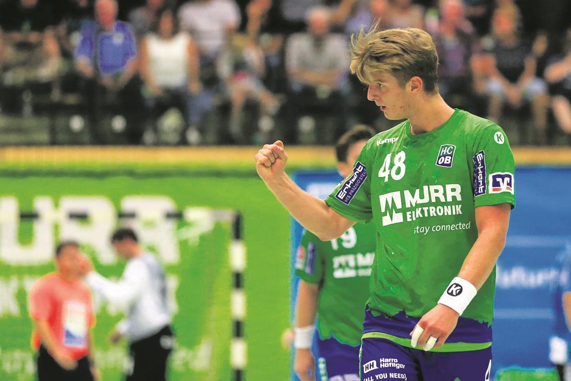 Felix Raff und die HCOB-Handballer ließen ihren Emotionen nach dem Heimsieg gegen den TSV Blaustein freien Lauf. Foto: A. Becher