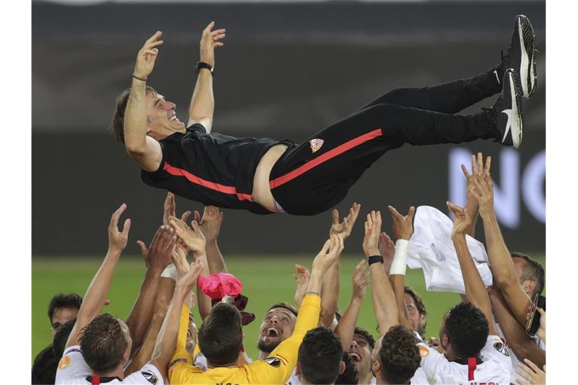 Sevillas Trainer Julen Lopetegui wird nach dem Finale in die Luft geworfen. Foto: Friedemann Vogel/Pool EPA/AP/dpa