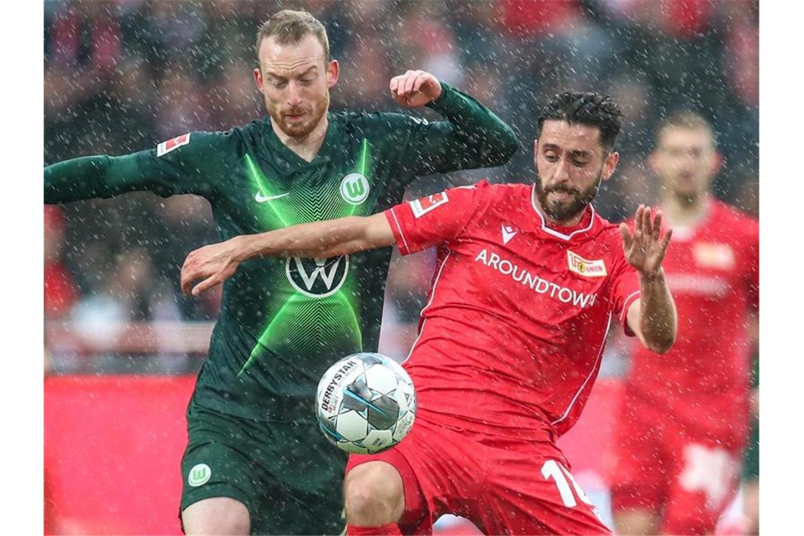 Wolfsburgs Maximilian Arnold (l) kämpft mit Unions Yunus Malli um den Ball. Foto: Andreas Gora/dpa