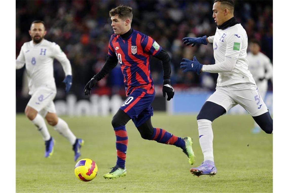US-Stürmer Christian Pulisic (10) kontrolliert den Ball zwischen Alfredo Mejia (8) und Devron Garcia aus Honduras. Foto: Andy Clayton-King/FR51399 AP/dpa