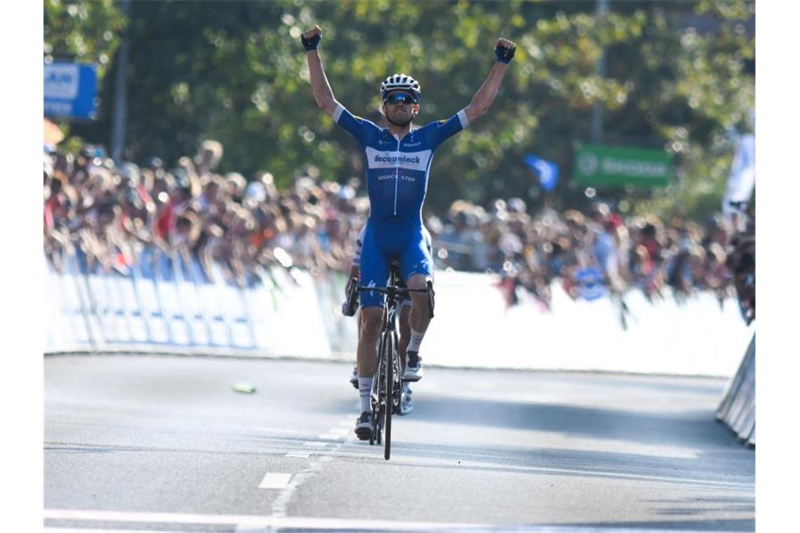 Der Däne Kasper Asgreen vom Team Deceuninck-Quickstep bejubelt seinen Etappensieg. Foto: Bernd Thissen