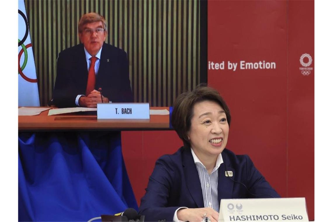 Videokonferenz mit IOC-Präsident Thomas Bach (l, auf dem Monitor) und Seiko Hashimoto, Präsidentin des Organisationskomitees. Foto: Yoshikazu Tsuno/Pool Gamma/AP/dpa