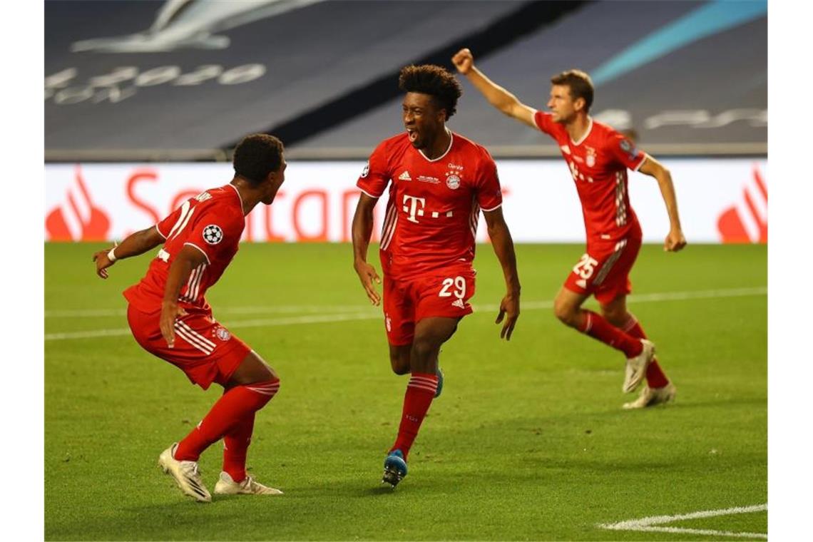 Kingsley Coman (M) von Bayern München feiert sein Tor zum 1:0 gegen Paris Saint-Germain. Foto: Julian Finney/Getty Images via UEFA/dpa