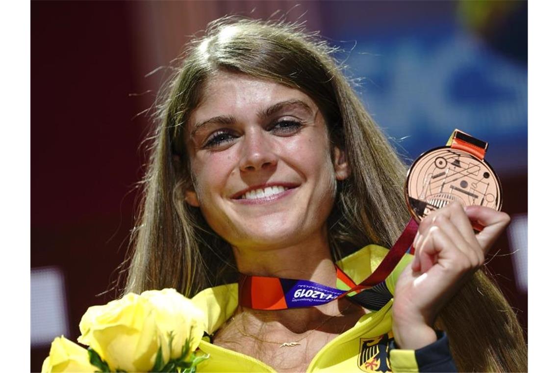 Konstanze Klosterhalfen zeigt nach der Siegerehrung ihre Bronzemedaille. Foto: Michael Kappeler/dpa