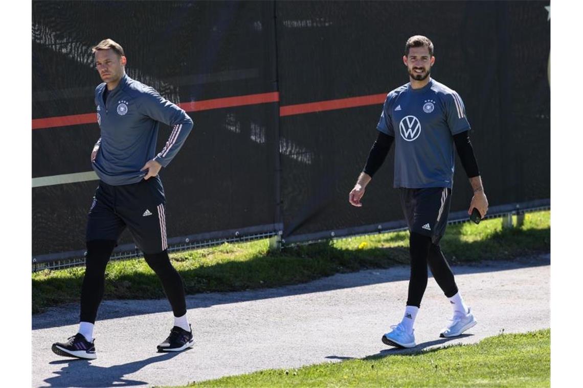 Manuel Neuer (l) und Kevin Trapp kommen zum Trainingsplatz. Foto: Christian Charisius/dpa