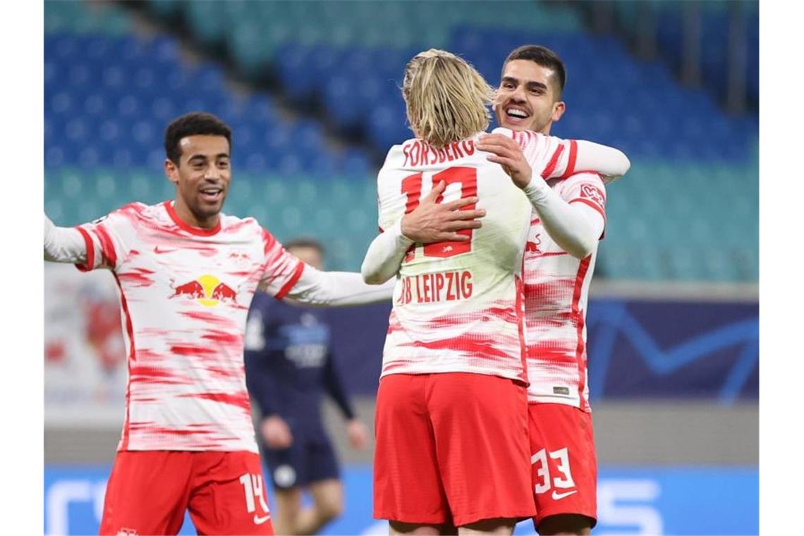 Leipzigs André Silva (r) bejubelt sein Tor zum 2:0 mit Tyler Adams (l) und Emil Forsberg. Foto: Jan Woitas/dpa-Zentralbild/dpa