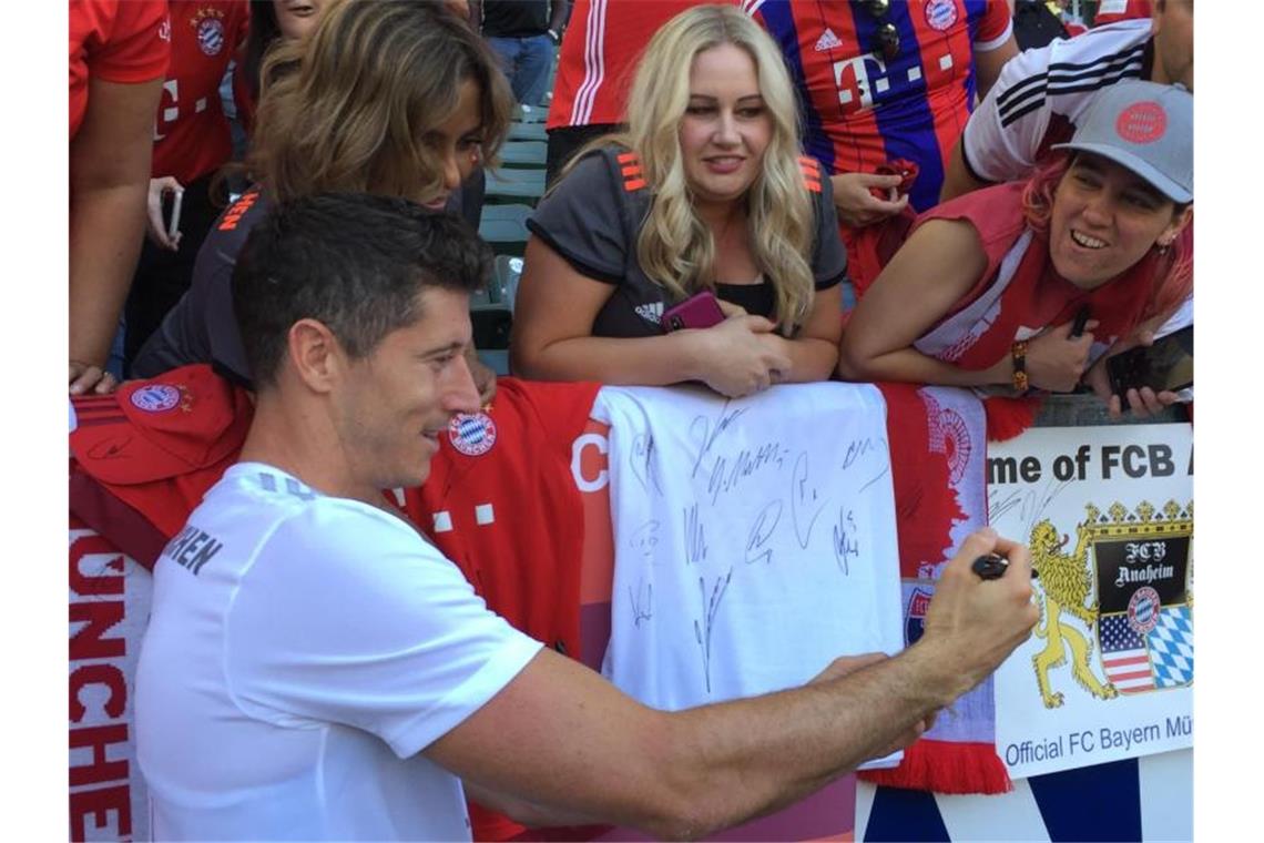 Robert Lewandowski gibt nach dem Training des FC Bayern im Stadion von LA Galaxy Autogramme. Foto: Klaus Bergmann