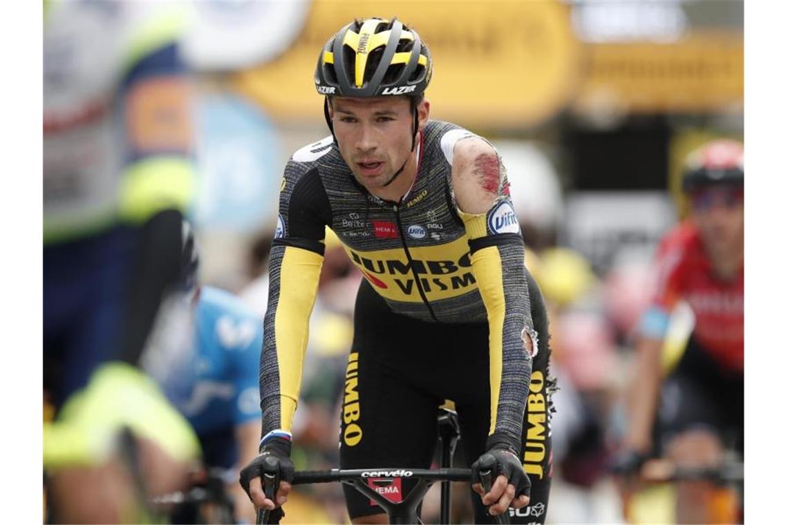 Primoz Roglic kam nach seinem Sturz mit Rückstand ins Ziel. Foto: Benoit Tessier/Pool Reuters/dpa