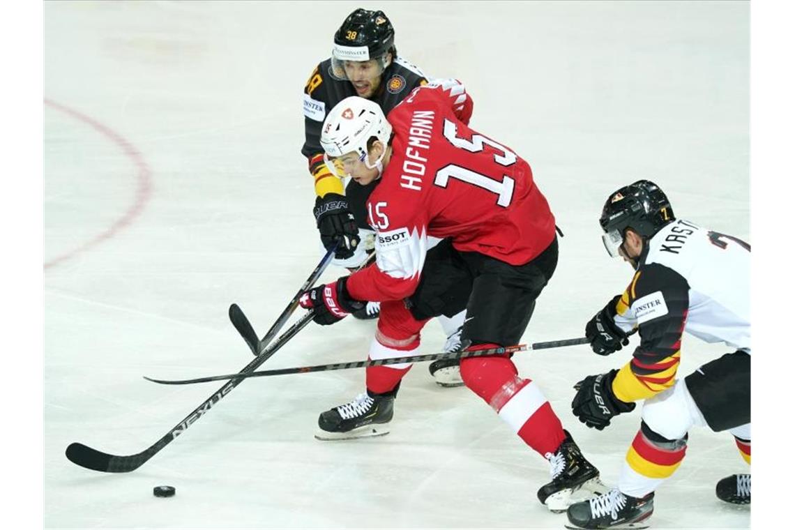 Fabio Wagner (l) und Maximilian Kastner (r) attackieren den Schweizer Gregory Hofmann. Foto: Roman Koksarov/dpa