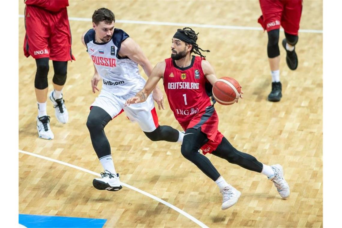 Deutschlands Joshiko Saibou (r) geht gegen Russlands Evgenii Baburin zum Korb. Foto: Tilo Wiedensohler/dpa