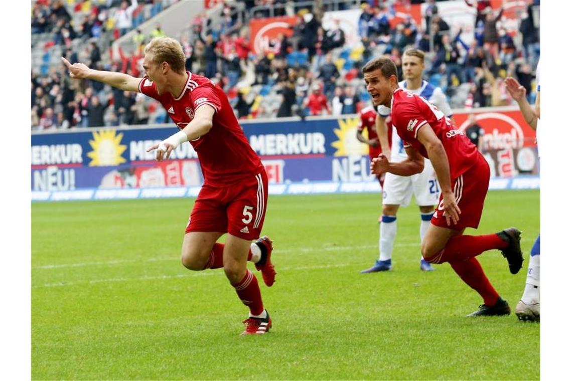 Jubelt nach seinem Tor zum 2:1: Der Düsseldorfer Christoph Klarer (l). Foto: Roland Weihrauch/dpa