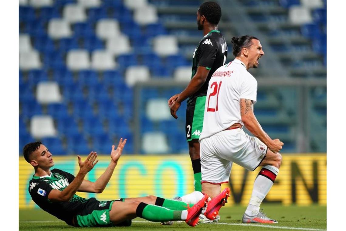 Zlatan Ibrahimovic (M) vom AC Mailand jubelt über sein Tor gegen Sassuolo Calcio. Foto: Spada/Lapresse/Lapresse via ZUMA Press/dpa