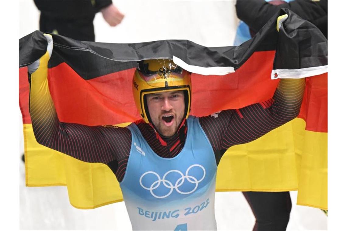 Rodler Johannes Ludwig feiert den Olympiasieg. Foto: Robert Michael/dpa-Zentralbild/dpa