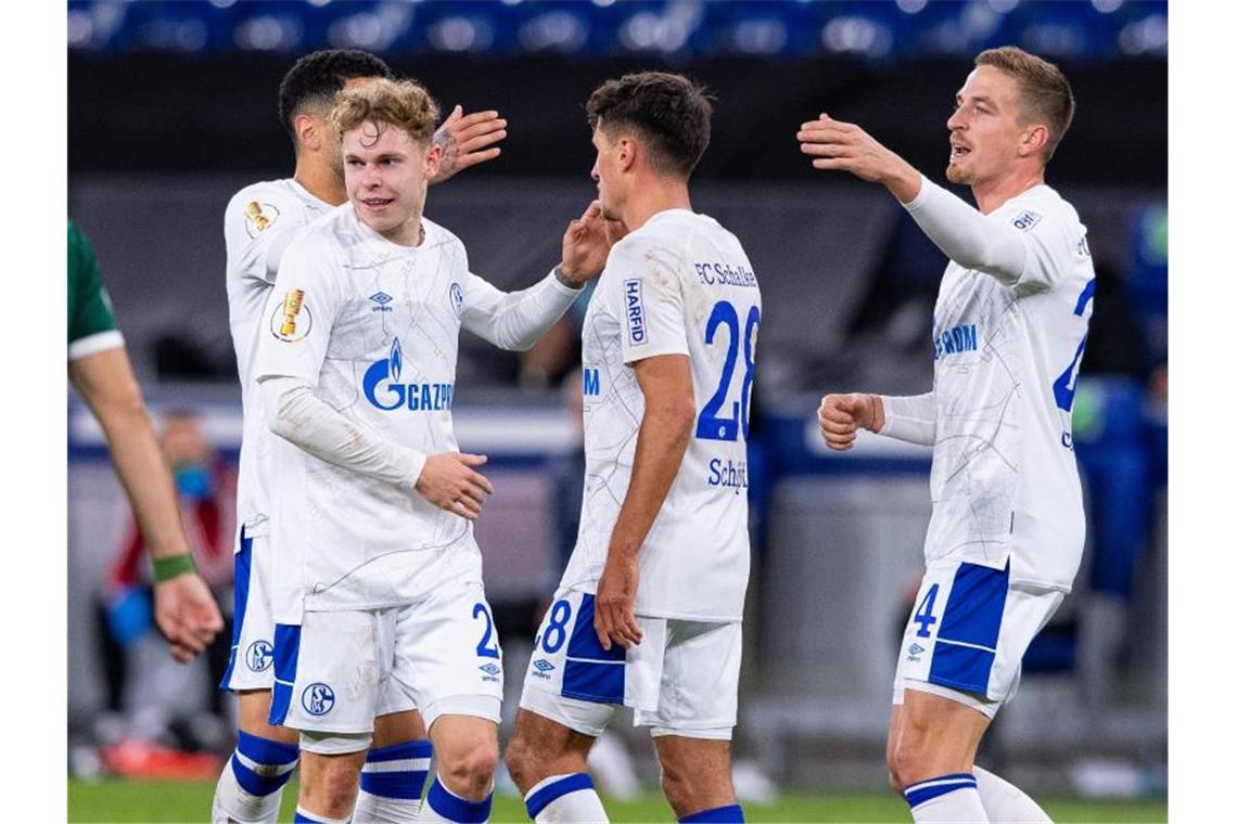 Die Spieler vom FC Schalke 04 feiern das Tor zur 3:1-Führung gegen den FC Schweinfurt. Foto: Guido Kirchner/dpa