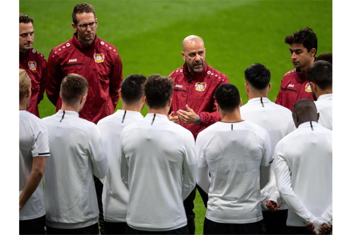 Leverkusens Trainer Peter Bosz (M.) bereitet seine Mannschaft in Madrid auf das Spiel vor. Foto: Marius Becker/dpa