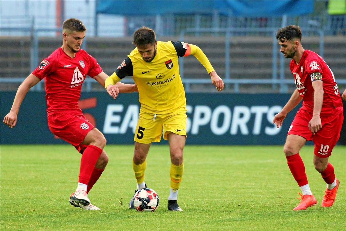 Auf der anderen Seite hatte Großaspach mit seinem kontrollierten Spielaufbau gegen eine vielbeinige Abwehr zwar ab und zu gute Ansätze, die ganz großen Chancen gab es aber erst wieder gegen Ende der ersten Halbzeit. Da aber gleich drei Stück. Zweimal scheiterte Mert Tasdelen mit Schüssen aus 17 Metern am gut reagierenden Schlussmann Enrico Piu (38. und 40.), dann kam Lukas Stoppel einen halben Schritt zu spät, um den Querpass von Tasdelen aus sieben Metern über die Linie zu drücken (44.).