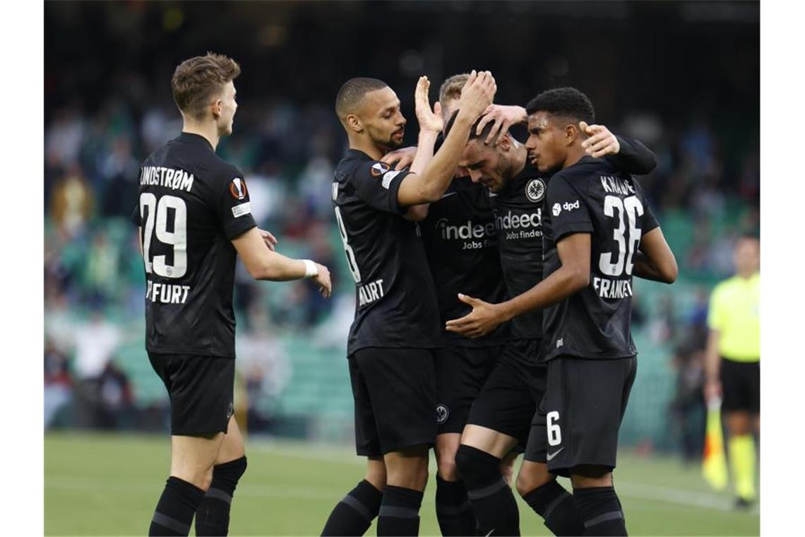 Spieler von Frankfurt feiern den Torschützen Kostic. Foto: Daniel Gonzalez Acuna/dpa