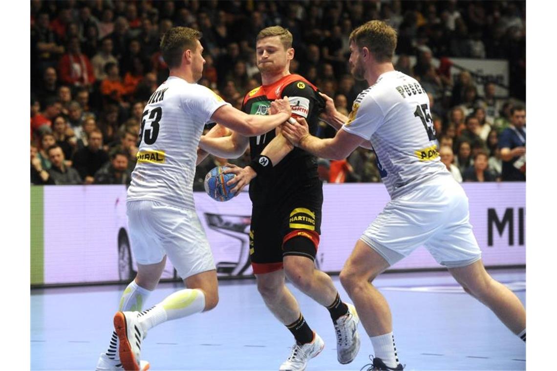 Die Österreicher Nikola Bilyk (l) und Fabian Posch (r) versuchen am Wurfkreis DHB-Spieler David Schmidt aufzuhalten. Foto: Herbert Pfarrhofer/APA/dpa