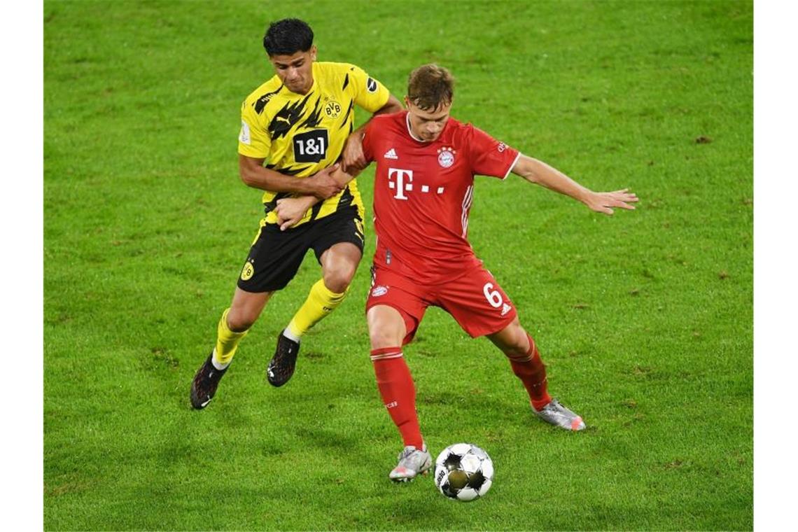 Dortmunds Mahmoud Dahoud (l) versucht Bayerns Joshua Kimmich den Ball abzunehmen. Foto: Andreas Gebert/Reuters/Pool/dpa
